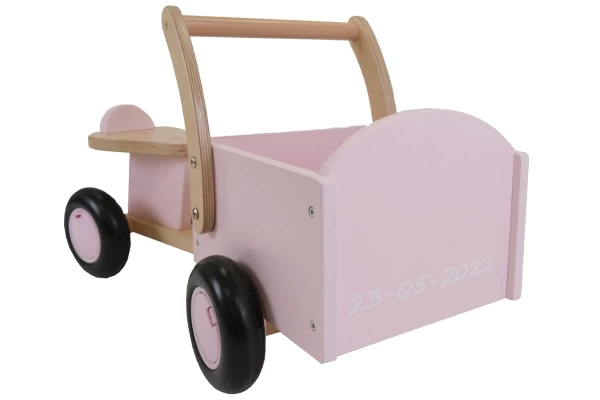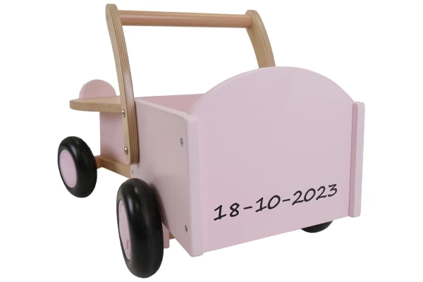 Welk speelgoed mag er mee in deze loopwagen? De houten bakfiets van Bandits & Angels in een retro groene kleur. Het zadel is 22,5 cm hoog en is voorzien van een opzetstukje tegen het afglijden. De vier wielen zorgen ervoor dat de loopwagen stabiel is. Ze zijn geluidsarm en krasvrij. De duwstang is 39 cm hoog en de loopwagen is voorzien van een stuurbegrenzer. Geschikt voor kinderen vanaf 1 jaar.