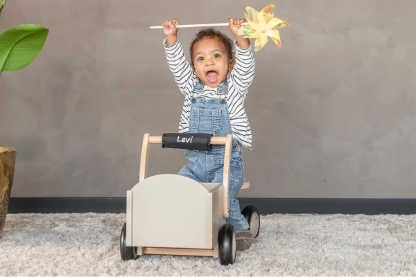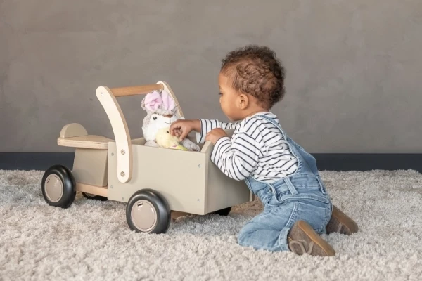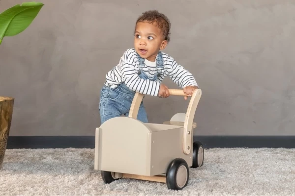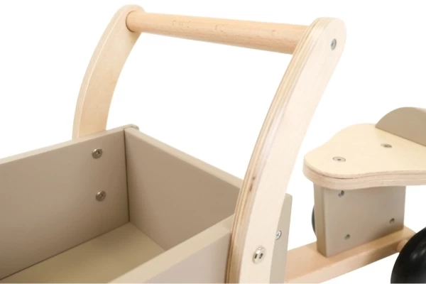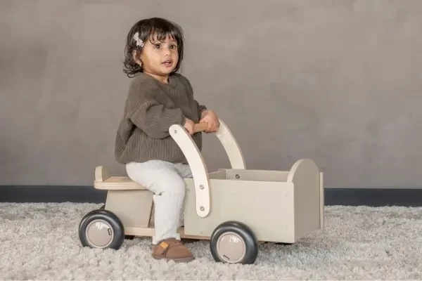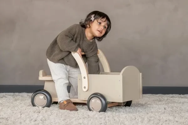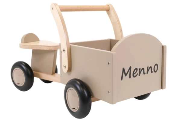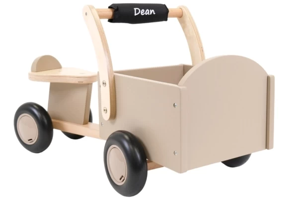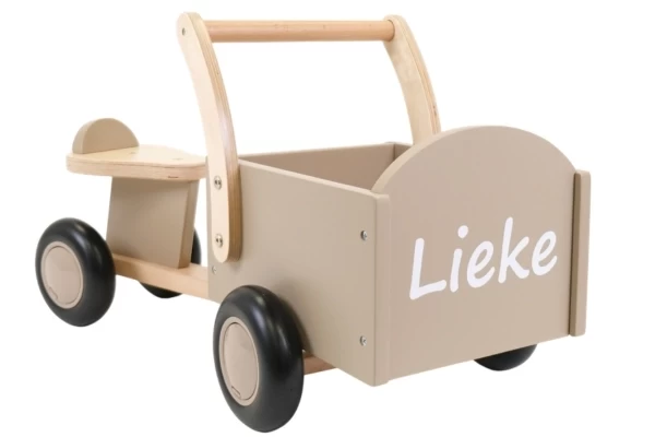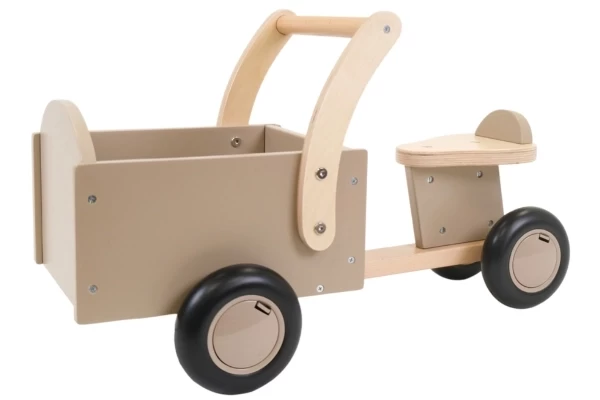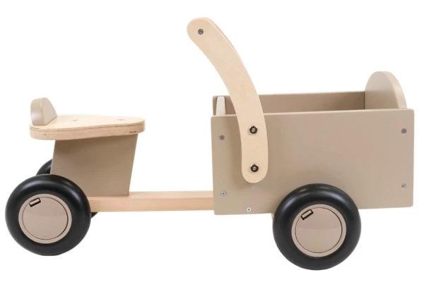 Een hippe bakfiets, voor kinderen vanaf 1 jaar. Deze prachtige zandkleur is geschikt voor zowel jongens als meisjes! Vasthouden kan aan het 39 cm hoge stuur. De zitting is 22,5 cm en is voorzien van een handig opzetstukje. Zo kan de bestuurder er niet afglijden. De vier geluidsarme wielen maken de Little Rider heel stabiel. In de bak voorop kunnen alle spulletjes mee. Personaliseer de bakfiets met een sticker of kinbeschermer met naam.